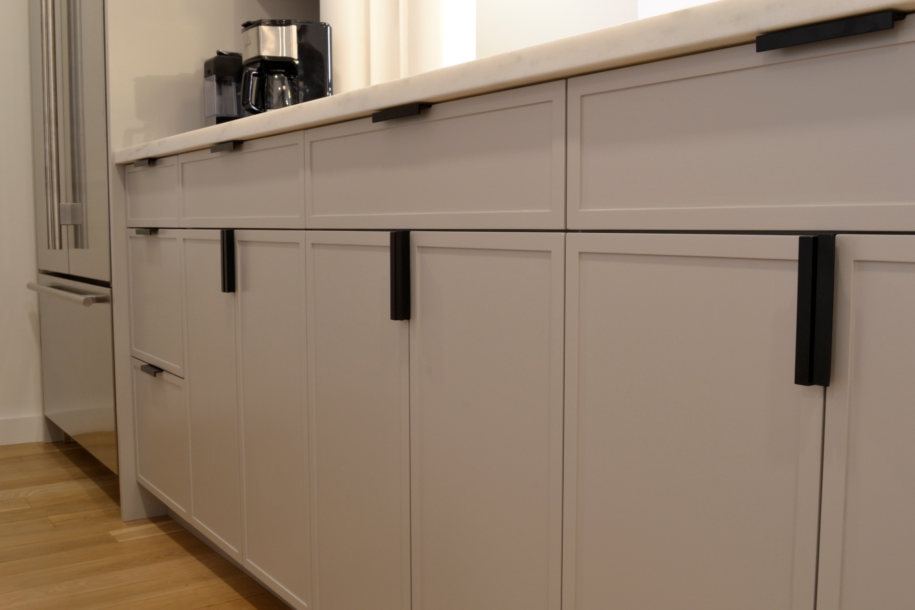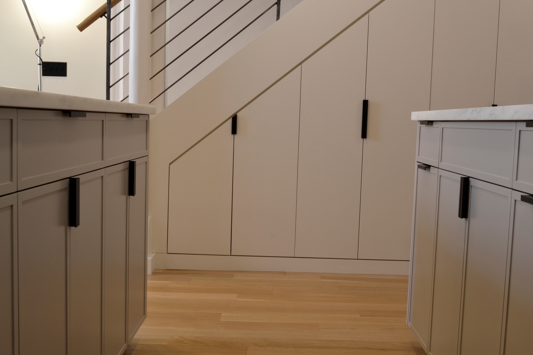 Custom kitchen and under-stairs cabinetry for this Cobble Hill Condo. The kitchen features skinny-shaker doors with a handbrushed finish.