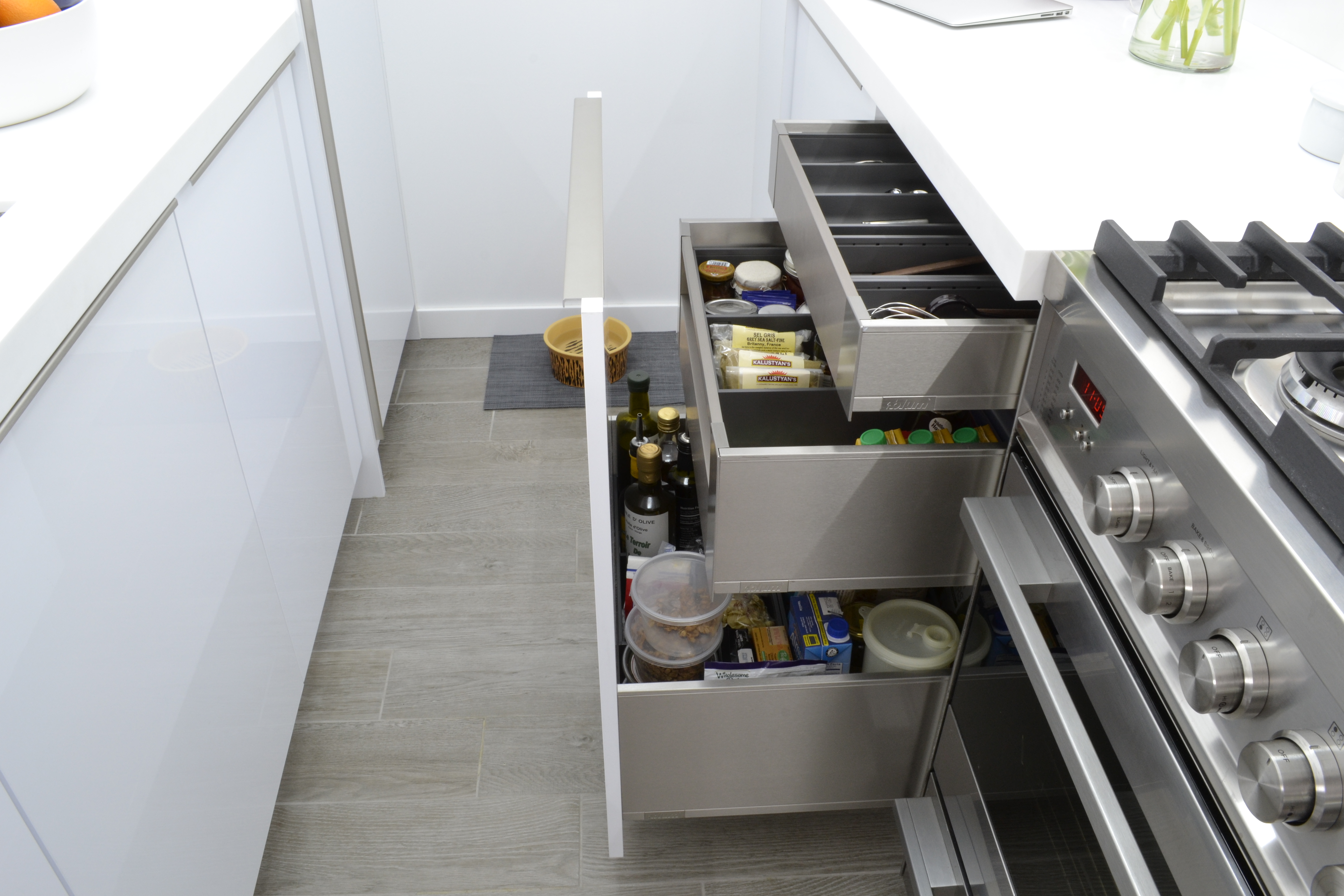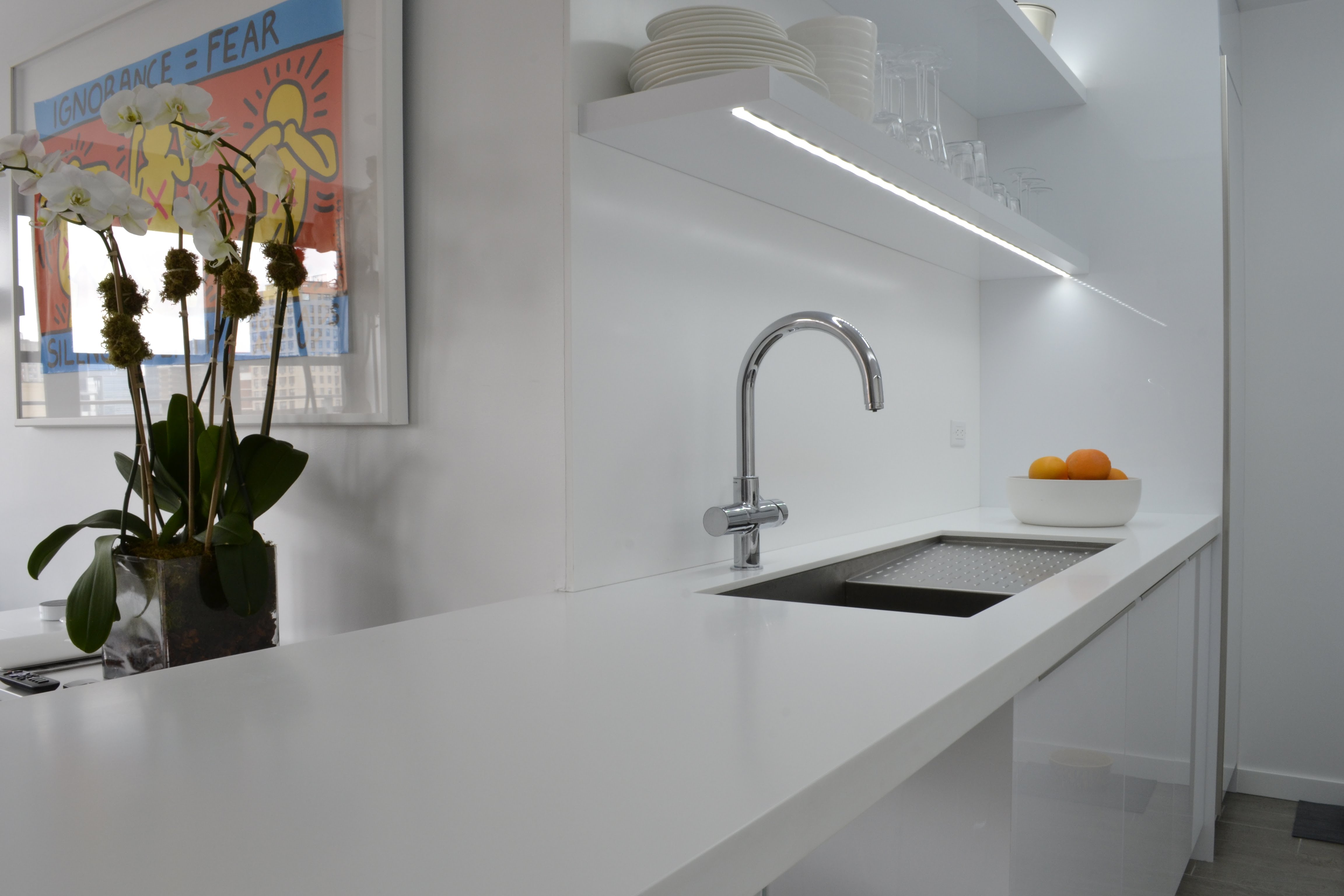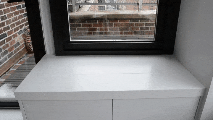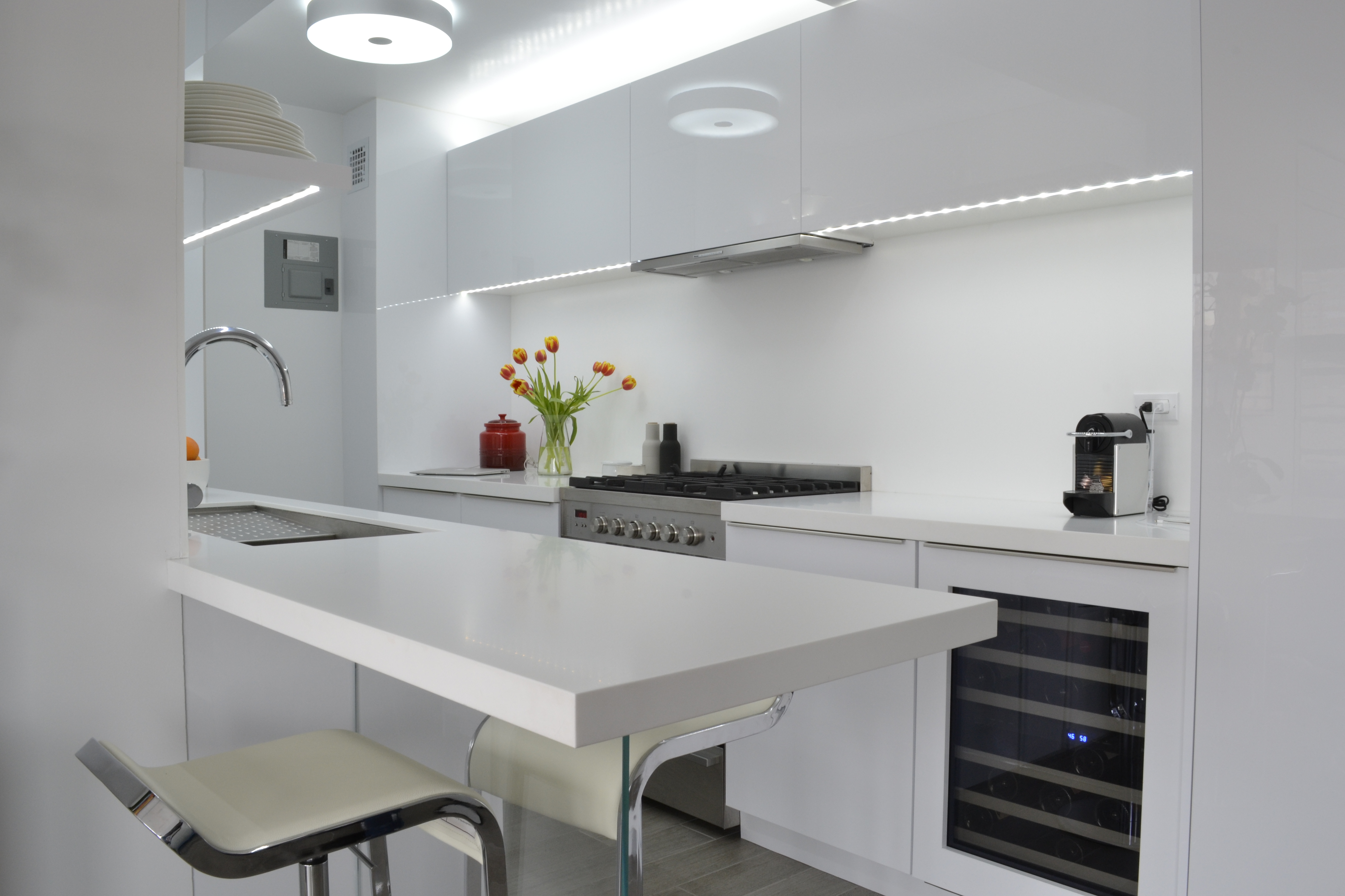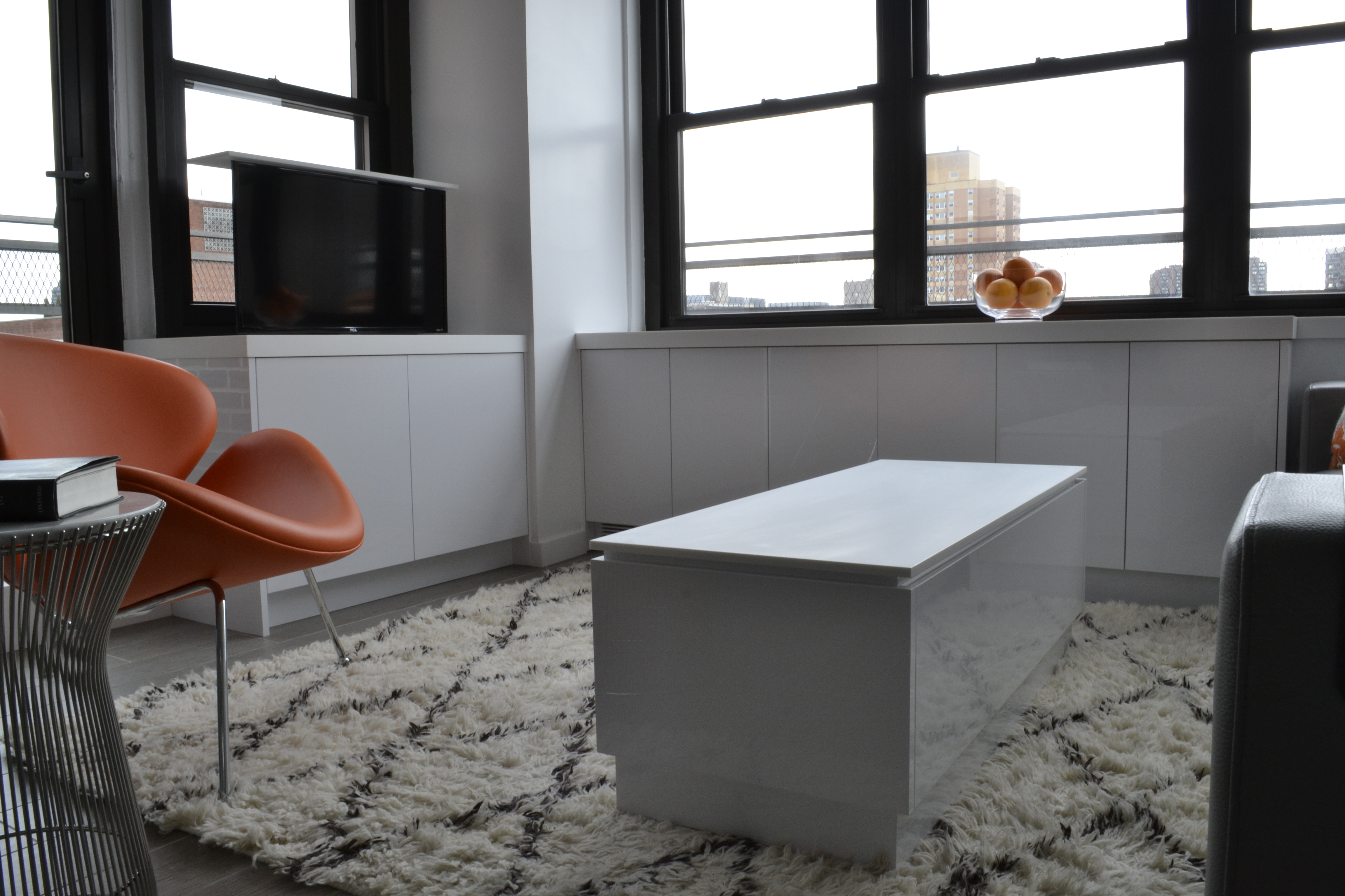 We built out all of the millwork for this studio apartment in the Kips Bay neighborhood, including the solid surface countertops throughout. The design features multiple-use elements such as a sliding closet, a cabinet with hidden TV lift, and a coffee table with integrated storage drawers.
